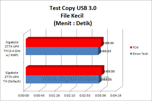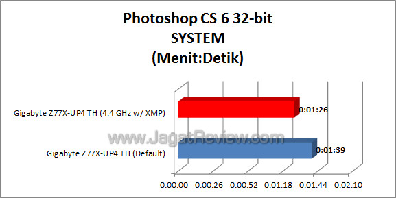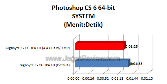 Gigabyte Z77-UP4 TH diuji pada dua kondisi yaitu pada kondisi normal (Load Optimized Default) dan di-overclock. Kondisi overclock dicapai dengan menaikkan nilai VCore ke 1.25 V untuk kemudian dilanjutkan dengan menaikkan nilai multiplier hingga mendapatkan clock speed paling stabil. (*) Hasil overclocking yang kami dapatkan belum tentu akan sama seperti yang akan Anda dapatkan meskipun menggunakan hardware yang sama.