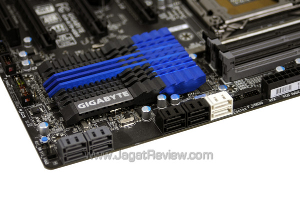 Gigabyte X79-UD5 tampil gagah dan elegan dengan balutan warna hitam yang dominan disertai selingan warna abu-abu dan biru pada heatsink.