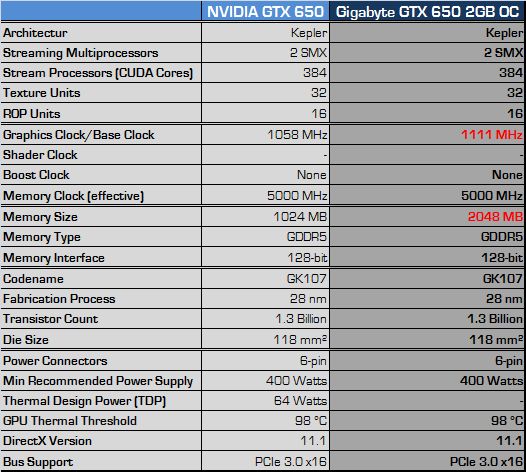 Gigabyte GTX 650 OC 2GB selain ukuran memory VRAM yang lebih besar, Gigabyte juga memberikan ekstra clock (pre-OC) sekitar 53 MHz lebih tinggi dibandingkan spesifikasi GTX 650 standar dari NVIDIA.