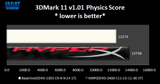 Aplikasi 3DMark11 merupakan sebuah benchmark 3D berbasis API DirectX 11. Salah satu pengujiannya yang berupa Physics Test cukup dipengaruhi kecepatan CPU dan memori yang sedang dijalankan. Di tes ini, sistem yang memiliki memory bandwidth besar akan mendapat skor yang optimal.