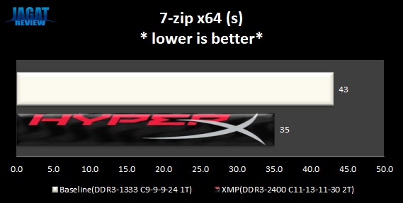 7-Zip 9.20 x64 adalah aplikasi yang biasa digunakan untuk melakukan kompresi file. Disini kami melakukan kompresi file campuran (JPG, MP3, video HD, dan lain sebagainya) sebesar 766MB, dan mencatat seberapa cepat sistem kami dalam melakukan kompresi tersebut. File dikompress ke format .7z, compression level Normal, compression method LZMA2, dictionary size 16MB, word size 32, solid block size 2GB, dan menggunakan semua thread yang bisa dimanfaatkan CPU (misal: Core i7-3930K bisa menjalankan kompresi menggunakan 12 thread yang tersedia)