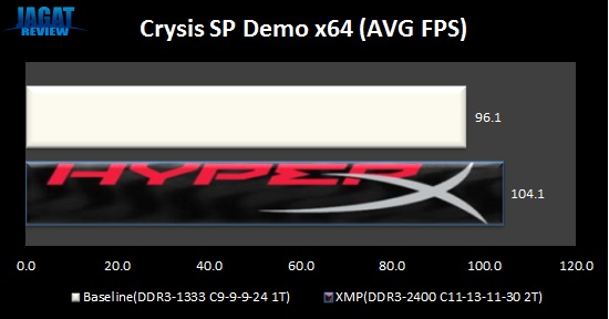 Untuk benchmark game kami menggunakan Crysis Single-Player Demo. Game yang dirilis lebih dari 3 (tiga) tahun lalu ini menjadi fenomena pada masanya sebagai game FPS yang terkenal ‘menyiksa’ VGA Card. Kami menggunakan versi 64-bit dari demo ini untuk menjalankan salah satu benchmark terintegrasinya, yaitu CPU benchmark. Disini banyak perhitungan physics yang dilakukan oleh sistem (baik CPU dan/atau memori), sehingga kami anggap cocok untuk dijadikan acuan performa memori. Supaya sistem kami tidak mengalami bottleneck pada VGA, kami ‘hanya’ menggunakan setting detail High, dan resolusi 720p (1280×720).