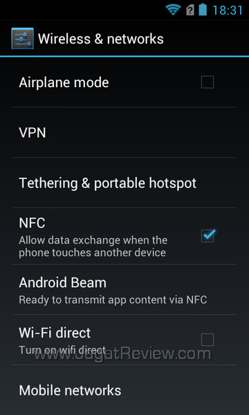 Feature NFC dapat diaktifkan melalui menu Wireless & Networks>NFC.