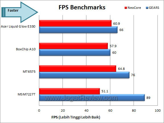 Kami menggunakan aplikasi benchmarking NeoCore dan GEARS. NeoCore merupakan aplikasi benchmark game yang menggunakan engine game dari Qualcomm. GEARS sendiri digunakan untuk menguji kemampuan OpenGL ES 1.0 dan 2.0 dari sebuah graphics processor.