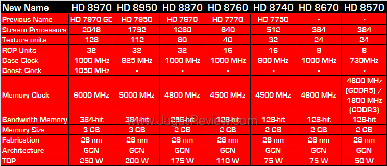 AMD memang tidak tanggung-tanggung dalam merilis varian HD 8000 untuk PC OEM dimana mereka mengisi setiap celah mulai dari kelas high-end hingga kelas entry-level. Di antara 9 buah varian di atas, 7 buah di antaranya menggunakan arsitektur Graphics Core Next generasi satu seperti seri HD 7000 Southern Island. Berikut spesifikasi lengkap graphics card tersebut.