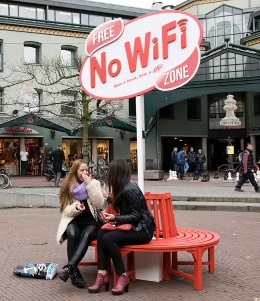 Pastinya kita akrab dengan slogan Kit Kat yang berbunyi “ada break, ada Kit Kat” tersebut. Rupanya slogan ini tidak hanya sekedar sebuah slogan iklan biasa, tetapi diaplikasikan untuk membuat konsep zona bebas wi-fi yang berlokasi di Armsterdam ini. Zona ini tidak akan memberikan Anda akses internet Wi-Fi gratis, melainkan zona ini malah akan memblokir berbagai akses internet dalam radius 5 meter.