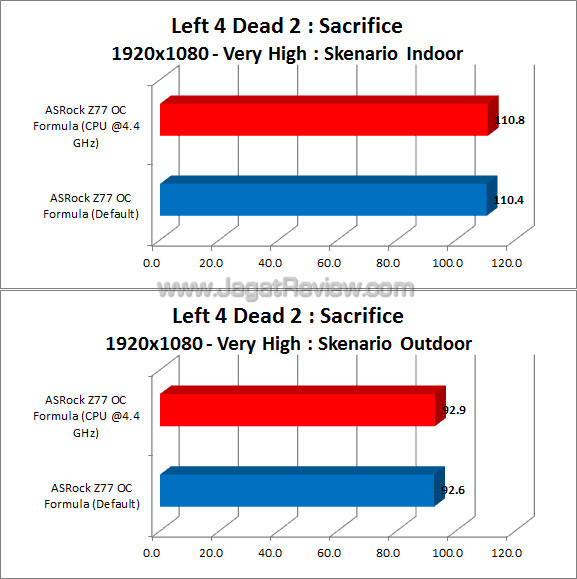 Left 4 Dead 2 merupakan salah satu game bergenre First Person Shooter yang cukup populer maka merupakan langkah yang tepat kami menggunakan game ini sebagai salah satu benchmark. Pengujian dilakukan dalam dua skenario yaitu skenario indoor dan outdoor. Skenario indoor lebih bergantung kepada kinerja prosesor sedangkan skenario outdoor bergantung sekali kepada kinerja GPU.