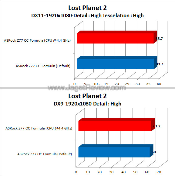 Lost Planet 2 adalah salah satu game 3rd person action yang cukup populer di pasaran. Maka dari itu kami menggunakan game ini sebagai salah satu barometer performa bagi pengujian hardware. Pengujian kami lakukan di mode DirectX 9.0 dan DirectX 11.0 menggunakan benchmark internal dari game ini sendiri.