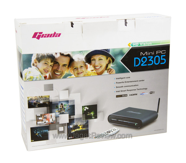 Pada sisi samping kemasan terpampang penjelasan spesifikasi Giada Mini PC D2305 yang ada di dalam kotak ini, termasuk warna yang digunakan. Produk yang kami terima ternyata selain menggunakan hard disk berkapasitas 500 GB, disertakan pula sebuah SSD berkapasitas 32 GB yang digunakan sebagai chace-drive. Keuntungan konfigurasi storage seperti ini adalah meningkatnya performa keseluruhan hard disk.