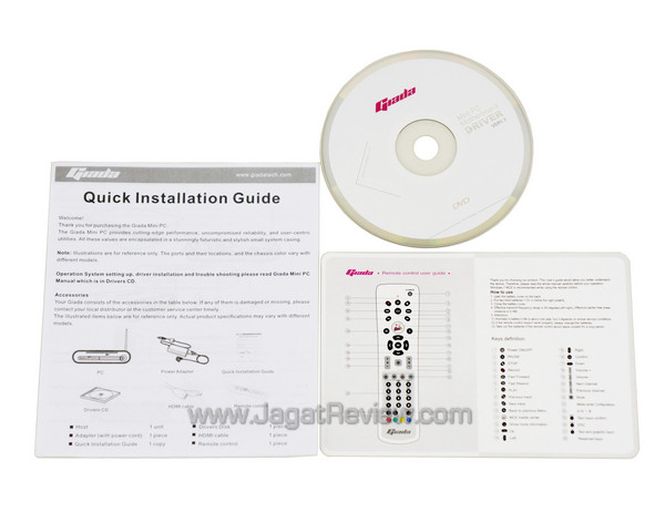 Giada menyertakan buku manual berisi cara pemasangan sistem, buku manual penggunaan remote, dan sebuah DVD berisi driver.