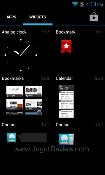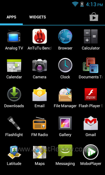 Menu utama atau app drawer menampilkan 20 buah icon aplikasi untuk setiap halamannya. Menu utama terdiri dari 2 kategori yaitu kategori APPS yang berisi semua aplikasi yang telah diinstall pada smartphone ini dan WIDGETS yang berisi berbagai macam widget yang dapat ditempatkan pada homescreen.