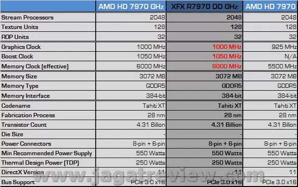 Graphics card Tahiti XT dari XFX ini sudah menggunakan BIOS (GHz) yang akan meningkatkan performa maksimumnya menggunakan clock Boost hingga 1050 MHz pada kondisi maksimumnya (peak). Selain Core Clock, pada HD 7970 GHz ini jumlah Memory Clock juga mengalami peningkatan dari 5500 MHz menjadi 6000 MHz (efektif GDDR5). Graphics card XFX R7970 DD GHz ini secara keseluruhan memiliki spesifikasi yang relatif sama dengan spesifikasi HD 7970 GHz reference dari AMD.