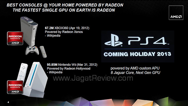 Tidak hanya di pasar PC, di tahun 2013 ini AMD juga telah siap untuk bermain di pasar console gaming. Console gaming next gen kini dipersenjatai graphics card dari AMD. Nintendo Wii U menggunakan graphics card dari AMD sedangkan Playstation 4 menggunakan prosesor AMD Jaguar delapan core dan juga GPU dengan 18 buah Compute Units (Radeon HD 7860?!) Sedangkan Xbox generasi tiga tampaknya juga akan menggunakan graphics card dari AMD.