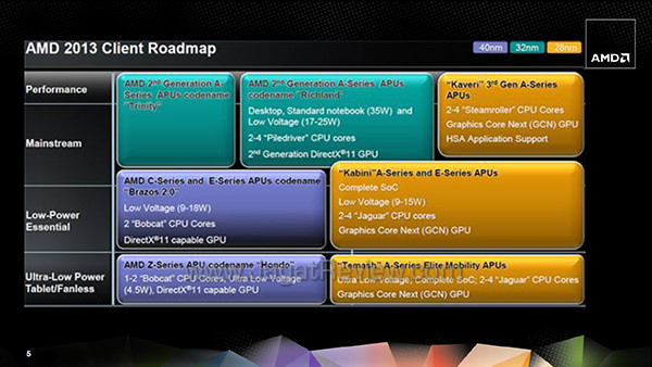 Menghadapi tahun 2013 AMD telah siap dengan berbagai senjata terbaru andalan mereka terutama di produk APU. Pada kuartal 3 tahun 2013, AMD direncanakan akan meluncurkan prosesor AMD APU Kabini dan juga Temash. Kabini akan menjadi penerus dari prosesor AMD seri E dan C. Kabini akan dilengkapi, maksimal, empat core Jaguar dan GPU berbasiskan GCN Southern Island. Sedangkan Temash akan menjadi pengganti prosesor APU Hondo untuk perangkat tablet. Temash juga akan dilengkapi, maksimal, empat buah core Jaguar dan GPU berbasiskan GCN tetapi akan memiliki konsumsi daya lebih rendah dari Kabini.