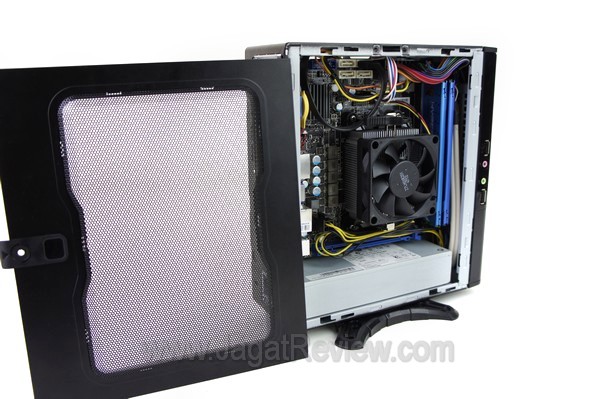 Karena ukuran yang pas-pasan, pemasangan motherboard ke casing ini memang terasa agak sulit, ukurannya yang sangat kecil pun membuatnya tidak bisa dipasangi sebuah kartu grafis tambahan. Power Supply yang diberikan cukup baik untuk menahan sistem berbasis AMD APU A6-5400K (sistem kami berada pada sekitar 73 W full-load CPU+GPU), walaupun mungkin kapasitas PSU yang digunakan agak kurang bagi pemakai A10-5800K dengan TDP 100W, dan seperti yang terlihat diatas, PSU yang disertakan hanya menyediakan konektor utama seperti 20+4pin, 4-pin 12V, SATA, dan floppy power connector.