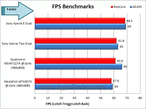 Kami menggunakan aplikasi benchmarking NeoCore dan GEARS. NeoCore merupakan aplikasi benchmark game yang menggunakan engine game dari Qualcomm. GEARS sendiri digunakan untuk menguji kemampuan OpenGL ES 1.0 dan 2.0 dari sebuah graphics processor.