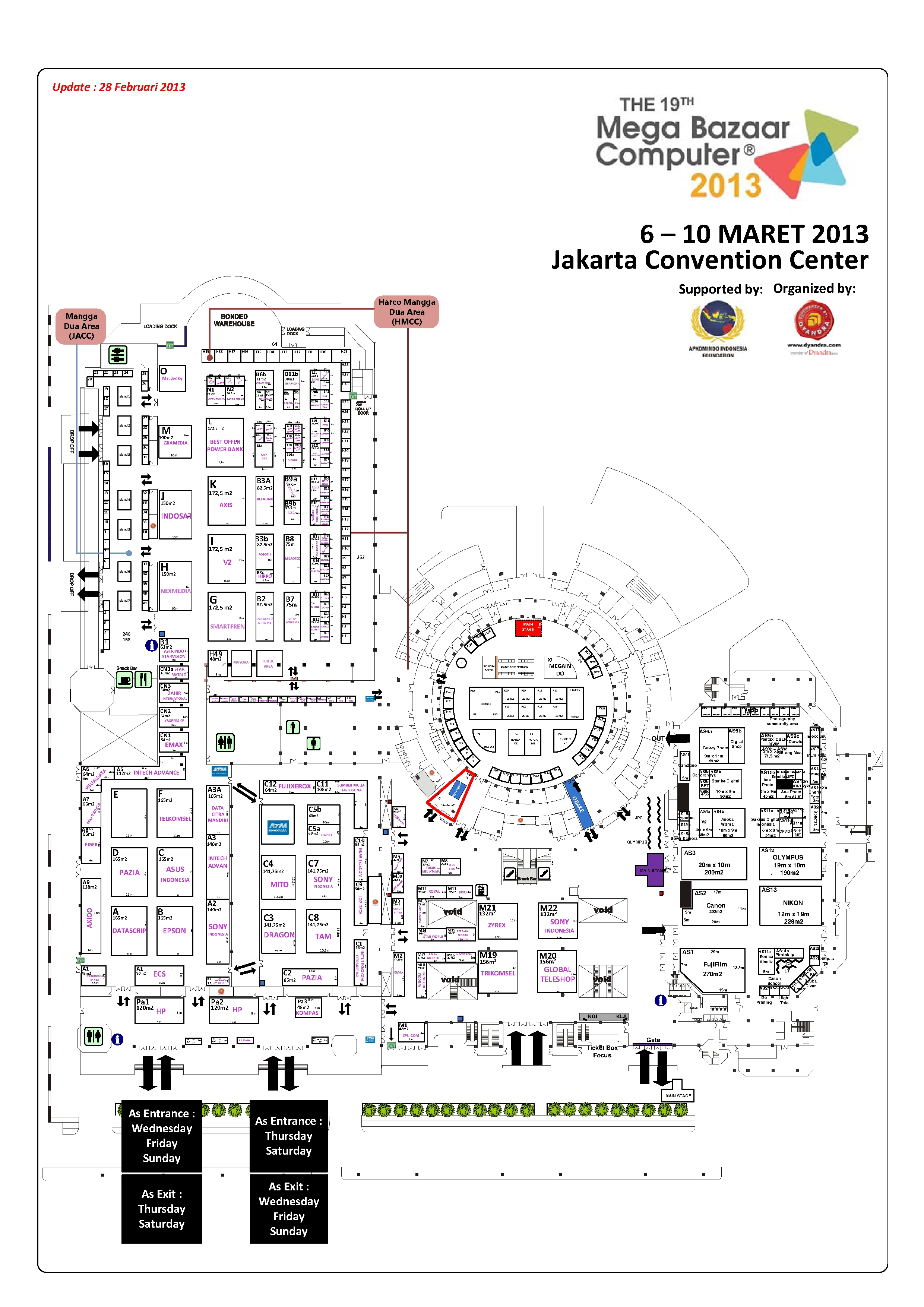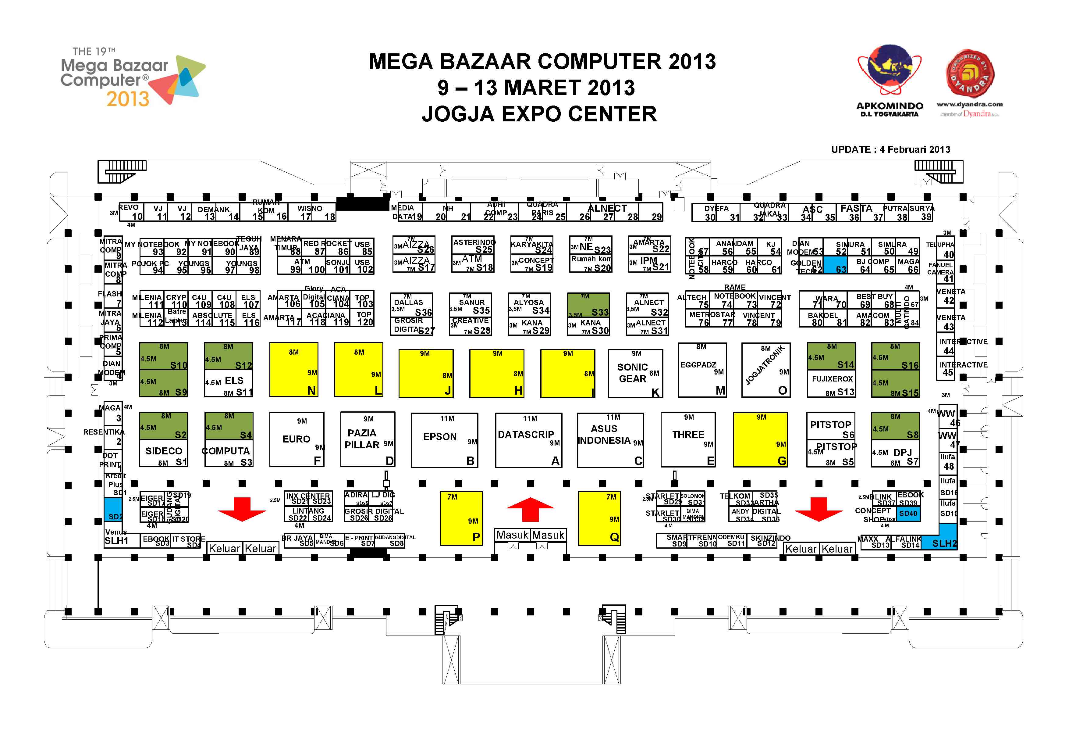 Event Mega Bazaar 2013 diadakan secara serentak di tujuh kota besar di Indonesia: Jakarta,Bandung, Surabaya, Yogyakarta, Semarang, Medan, dan Makassar. Event ini sendiri akan diadakan pada tanggal 6 Maret 2013 – 10 Maret 2013. Bagi para pemburu perangkat elektronik, ini tentu akan menjadi kesempatan terbaik untuk mendapatkan gadget-gadget incaran dengan beragam promo menarik. Untuk memastikan Anda dapat memanfaatkan waktu yang ada seefektif mungkin, kami menyediakan denah floorplan untuk memudahkan Anda berburu. Artikel ini tentu akan diikuti dengan beragam promo menarik yang akan kami rangkum dalam artikel selanjutnya. Jadi, tunggu apa lagi, selamat berbelanja.