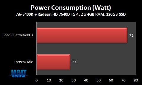 Sistem mini-ITX yang kami uji memenuhi persyaratan konsumsi daya yang kami berikan kepadanya : sistem hanya mengkonsumsi daya sekitar 70 Watt-an pada gaming load. Pada keadaan idle, prosesor A6-5400K hanya mengkonsumsi daya yang cukup rendah yakni sekitar 27 Watt, yang memperlihatkan bahwa sistem manajemen daya pada APU AMD Trinity sudah cukup baik dibanding generasi-generasi pendahulunya.