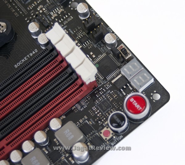 Pada pojok kanan atas motherboard dapat dijumpai tombol power on, reset, GO Button, dan switch Slow Mode di dekat Debug LED. Switch Slow Mode berguna saat pengguna menggunakan motherboard ini saat melakukan overclocking terutama pada kondisi ekstrim. Sedangkan tombol GO Button berguna untuk mengaktifkan MemOK! dan juga me-load OC profile saat berada di sistem operasi.
