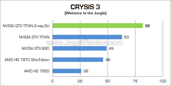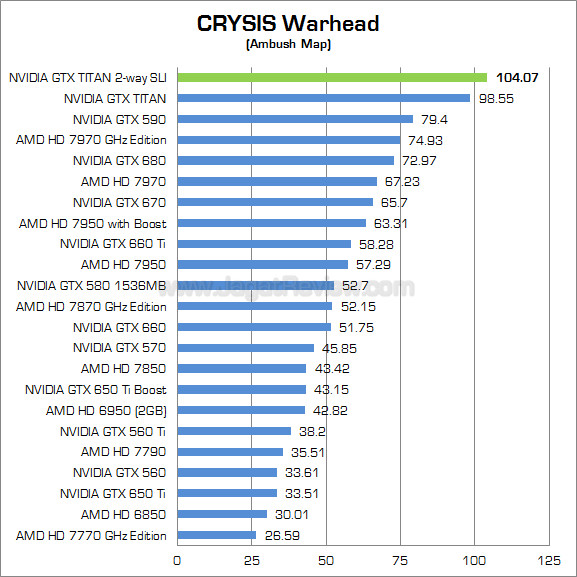 Game FPS berbasis Cry Engine generasi awal ini ternyata hanya mendapatkan peningkatan performa sekitar 5% saja saat menggunakan GeForce GTX TITAN di konfigurasi 2-way SLI.