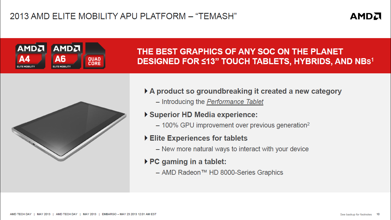 Prosesor AMD APU Temash diperuntukkan bagi perangkat mobile seperti tablet, tablet hybrid, dan notebook entry-level dengan ukuran layar 13 inci dan di atasnya.