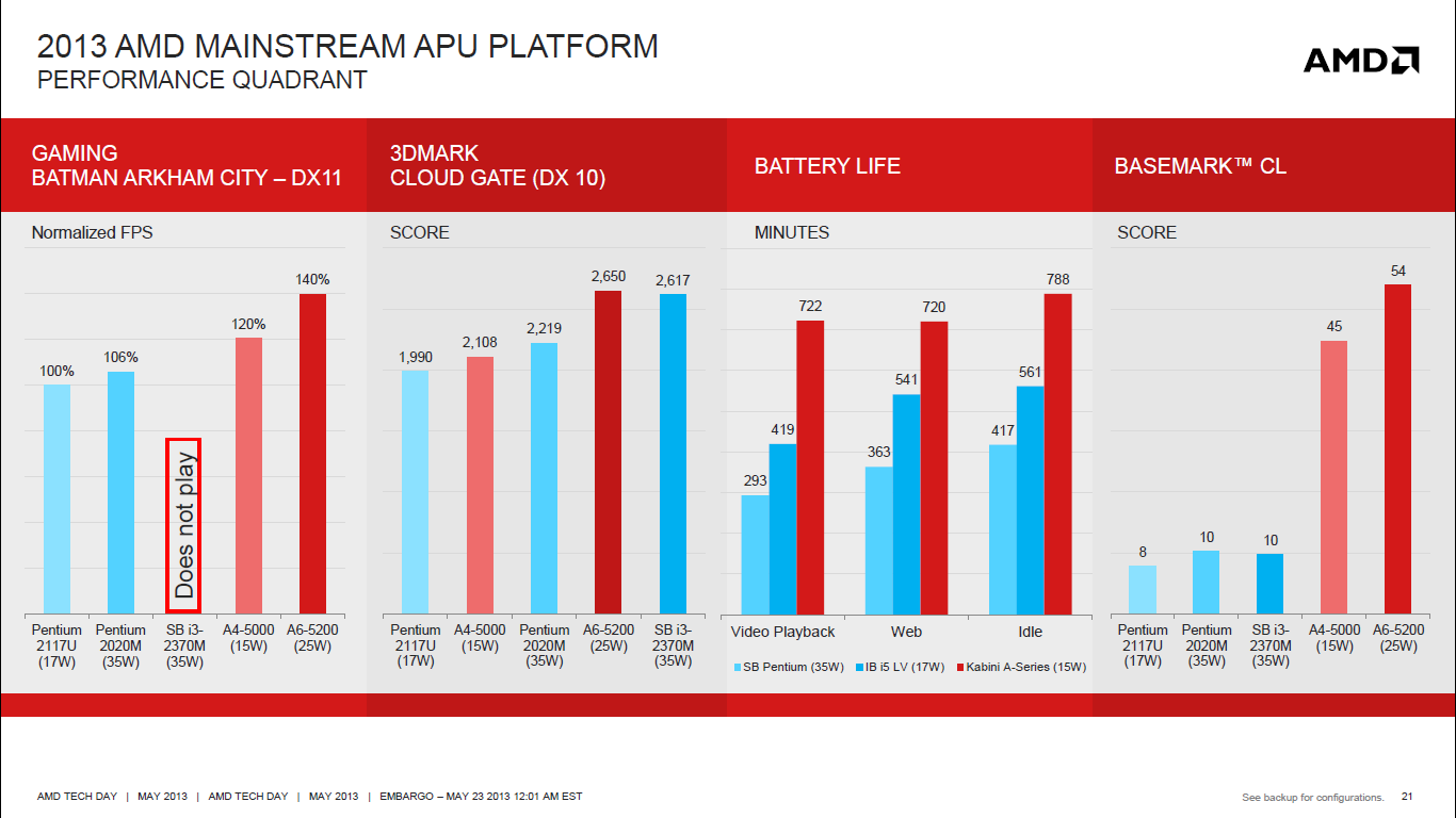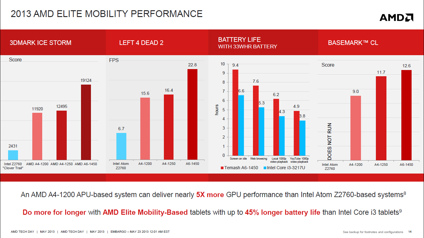 Dari slide presentasi di atas terlihat prosesor AMD APU Temash menjanjikan performa lebih baik dibandingkan prosesor Intel Atom Z2760. Bahkan AMD menjanjikan perangkat dengan prosesor APU Temash memiliki umur baterai lebih baik dibandingkan Intel Core i3 3217U.