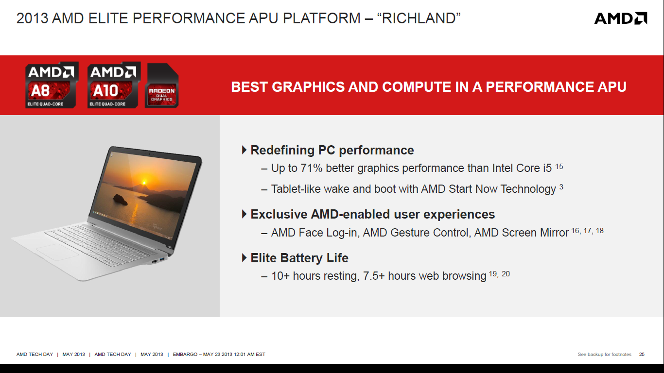 Prosesor AMD APU Richland diklaim memiliki performa lebih baik dibandingkan prosesor Intel hingga Core i5 seri M di berbagai pengujian gaming.