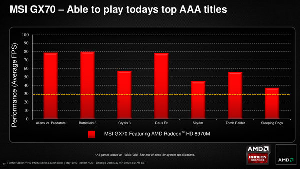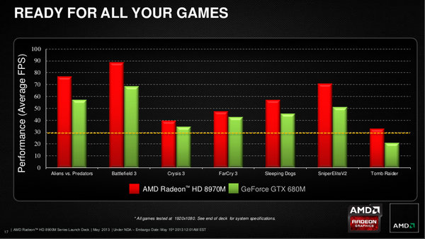 AMD memposisikan Radeon HD 8970M untuk menghadapi GeForce GTX 680M dari NVIDIA. Terlihat pada slide milik AMD di atas Radeon HD 8970M mampu menghadirkan performa gaming lebih baik.