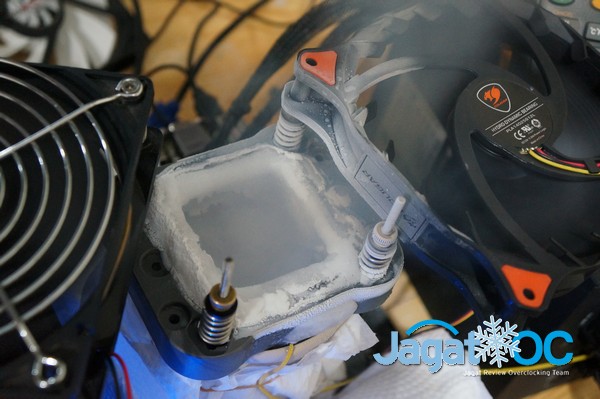 Untuk menyiapkan motherboard ini sebelum melakukan extreme overclocking, kami meng-insulasi motherboard menggunakan kneaded eraser, supaya komponen di sekitar CPU tidak rusak / gagal beroperasi karena kondensasi.