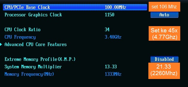 Berikut adalah setting awal BIOS yang kami gunakan. PERHATIAN: Tingkat Voltase yang digunakan disini SANGAT BERBAHAYA dan BISA MERUSAK CPU jika tidak dilakukan dalam keadaan suhu sangat dingin (setidaknya -100 C)