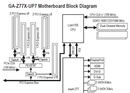 Pada Gigabyte Z77X-UP7, Gigabyte menggunakan sebuah PCIe Gen3 Switch PLX PEX 8747, yang memberikan dukungan untuk penggunaan Multi-GPU hingga 4-way (dengan konfigurasi lane PCIe 8x 8x 8x 8x). Sayangnya penggunaan PEX 8747 ini dipercaya bisa memberi penalti performa kecil pada skenario single-GPU (sekitar 0.5 – 1 %), karena adanya latency tambahan dari GPU ke PCIe Controller yang ada di CPU. Untuk mengatasi hal ini, Gigabyte memberikan sebuah ‘Direct PCIe 16x Slot’ yang langsung tersambung ke PCIe Controller pada CPU, memberikan performa terbaik untuk skenario Single GPU namun tetap fleksibel untuk mendukung mode 4-Way Multi-GPU.
