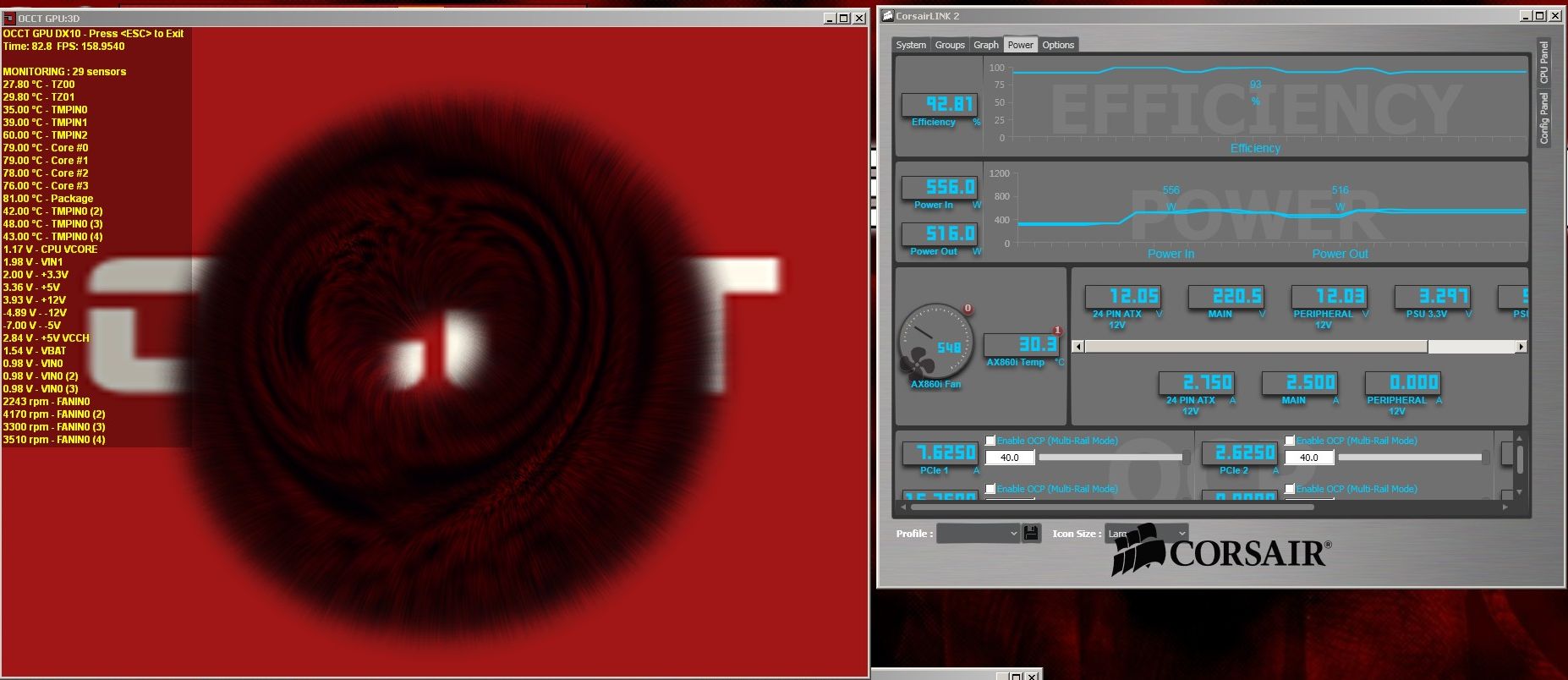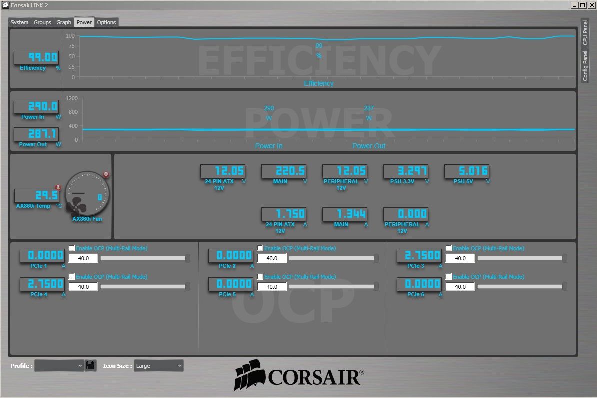 Sayang, meskipun Corsair LINK menawarkan monitoring konsumsi daya, angka yang didapat belumlah 100% akurat. Pada kondisi idle, ada perbedaan sekitar 20W antara pembacaan di power meter, dan di software Corsair LINK, seperti terlihat dibawah ini: