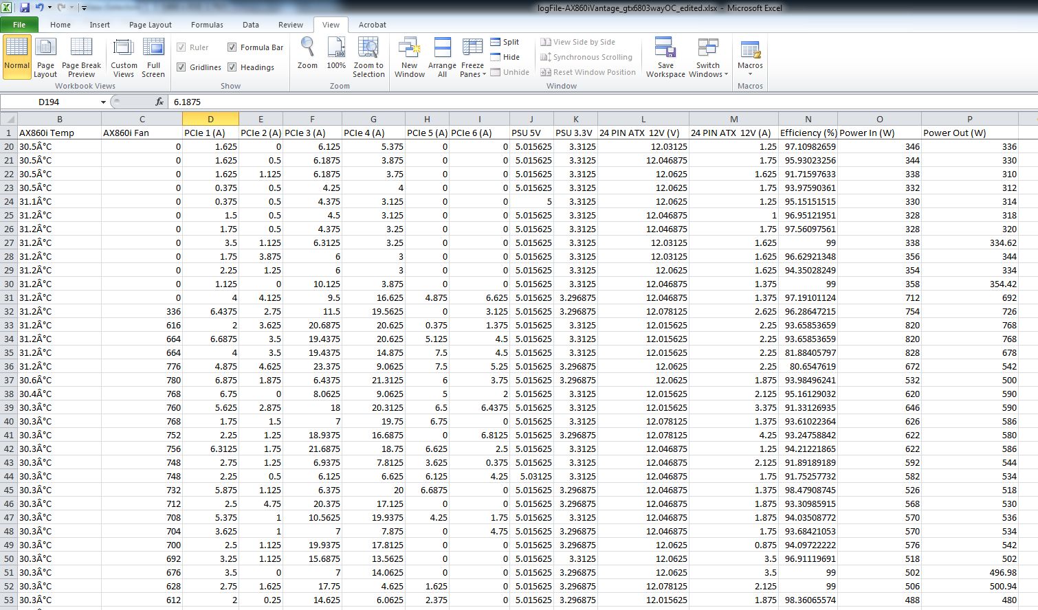 Yang menarik, Corsair LINK software memiliki fungsi untuk melakukan logging dari data-data seputar power supply anda, misalnya voltase di ATX 12V Connector, load pada PCIe connector, dsb. File log tersebut bisa dengan mudah anda buka pada program spreadsheet yang kompatibel, misalnya MS Excel. Dibawah ini anda bisa temukan contoh file report yang di-generate oleh Corsair LINK: