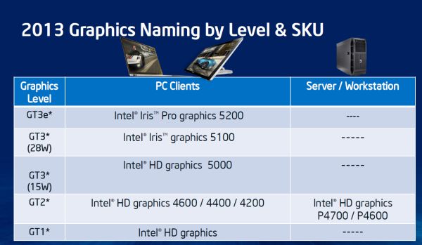 Tepat pada tanggal 1 Mei 2013 kemarin, Intel secara resmi memberikan sebuah ‘nama’ kepada 2(dua) konfigurasi tertinggi grafis terintegrasi-nya, yang disebut sebagai Intel Iris™ Graphics dan Intel Iris™ Pro Graphics. Skema penamaan ini berbeda dengan yang sebelumnya, dimana Intel menamakan IGPnya dengan sebutan ‘Intel HD Graphics’. Namun perlu diingat, tidak semua IGP Haswell GT3 akan mendapat ‘nama’ Iris™, misalnya saja Haswell GT3 dengan konfigurasi TDP 15W – yang masih disebut Intel HD Graphics 5000.