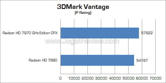 Pada grafik di atas terlihat konfigurasi 2 buah Radeon HD 7970 GHz Edition pada konfigurasi Crossfire menghasilkan performa lebih tinggi dibandingkan Radeon HD 7990. Meskipun begitu selisih performa tersebut hanya berkisar 5% pada 3DMark 11 dan 6% pada 3DMark Vantage. Perbedaan performa tersebut lebih disebabkan karena Radeon HD 7970 GHz Edition memiliki keunggulan di sisi nilai clock GPU.