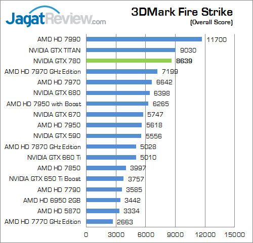 Benchmark terbaru besutan Futuremark dengan teknologi DirectX 11 ini memperlihatkan keunggulan sekitar 35% pada GeForce GTX 780 atas GeForce GTX 680. Semeentara itu, selisih performa tergolong kecil kami jumpai antara GeForce GTX 780 dan GeForce GTX TITAN dengan nilai sekitar 5%.