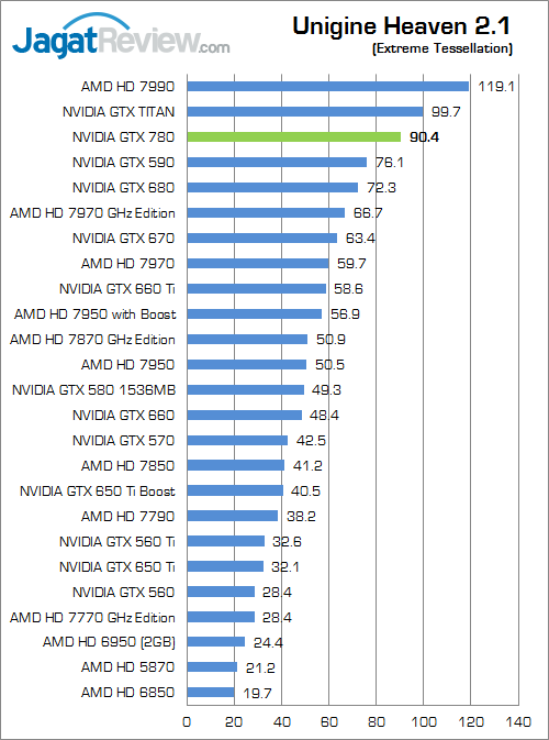 Pada UH 2.1, GeForce GTX 780 unggul sekitar 25% di atas GeForce GTX 680 tetapi tertinggal sekitar 10% di belakang GeForce GTX TITAN. Sedangkan pada UH 4.0 GeForce GTX 780 unggul sekitar 35% di atas GeForce GTX 680 dan tertinggal sekitar 12% di belakang GeForce GTX TITAN.