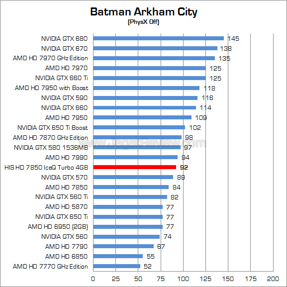 Pada game superhero berbasis Unreal Engine 3.0 ini, HIS HD 7850 iPower IceQ Turbo 4GB unggul sekitar 8% di atas HD 7850 reference.