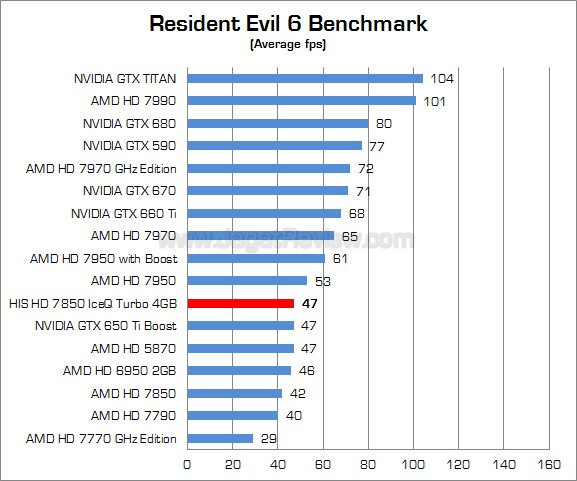 Game horor terbaru dari Capcom ini mampu ditampilkan dengan frame rate sekitar 11% lebih tinggi pada HIS HD 7850 iPower IceQ Turbo 4GB dibandingkan HD 7850 reference.