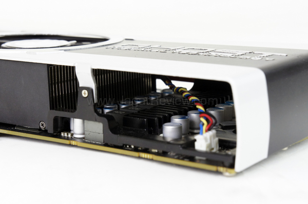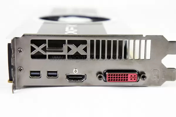 Dengan ketersediaan konektor display seperti ini pengguna dapat dengan mudah menggunakan konfigurasi multi-monitor Eyefinity baik dengan 3 buah monitor atau lebih. Untuk membedakan dengan produsen lainnya, XFX mengukir logo mereka pada bracket display.