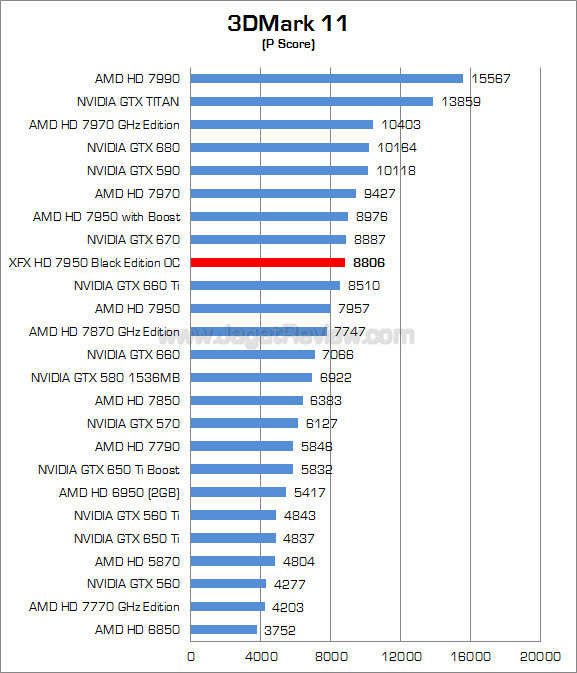 Benchmark sintesis DirectX 11 ini memperlihatkan keunggulan sekitar 11% atas XFX HD 7950 Black Edition OC di atas HD 7950 reference.