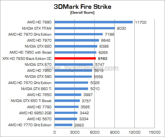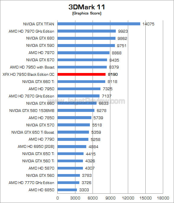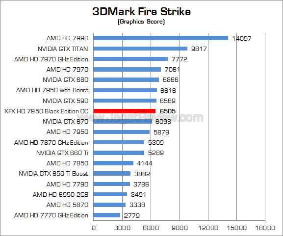 Benchmark sintesis terberat dari Futuremark ini memperlihatkan XFX HD 7950 Black Edition OC unggul sekitar 10% di atas Tahiti Pro dengan clock reference.