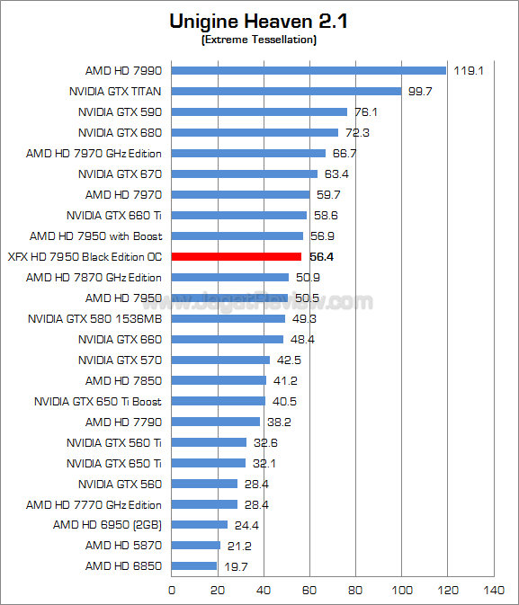 Benchmark sintesis dengan menu utama pengujian Tessellation DirectX 11 ini memperlihatkan XFX HD 7950 Black Edition OC unggul sekitar 11% di atas HD 7950 reference di kedua versi benchmark.