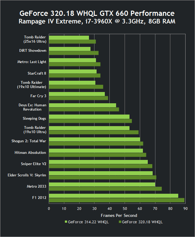 Dengan perilisan graphics card terbarunya GeForce GTX 780 beberapa hari lalu, NVIDIA langsung merilis driver terbarunya ForceWare 320.18 WHQL. Walaupun memang bersamaan dengan perilisan graphics card GTX 780, ForceWare 320.18 WHQL ini memberikan peningkatan performa untuk berbagai game terbaru saat ini untuk graphics card GeForce lainnya seperti GTX 660 yang ditunjukkan pada chart dibawah ini.