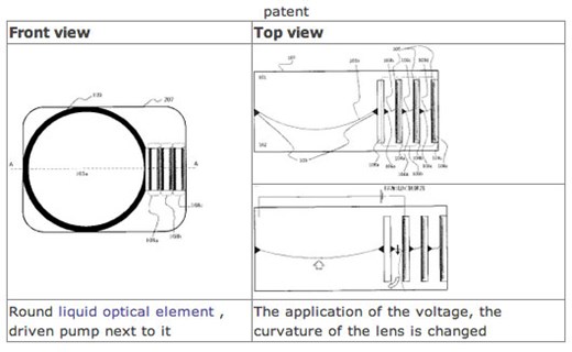 Paten dari Canon tersebut juga mengindikasikan bahwa ide tersebut cukup baik dikembangkan, dengan satu desain menghadirkan serangkaian pompa segitiga yang diatur dalam pola cincin konsentris. Paten tersebut menunjukkan bahwa lensa tersebut bisa digunakan untuk kamera ponsel maupun untuk kamera pengintai.