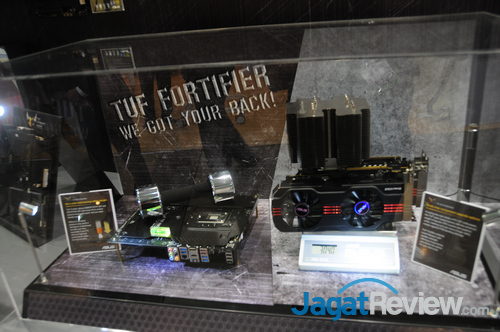 Di sisi kanan display terlihat dua buah graphic card ditambah satu heatsink sedang ditimbang. Ini melambangkan berat yang rata-rata harus diterima sebuah motherboard. Apa yang terjadi ketika berat itu dibebankan pada TUF Fortifier?