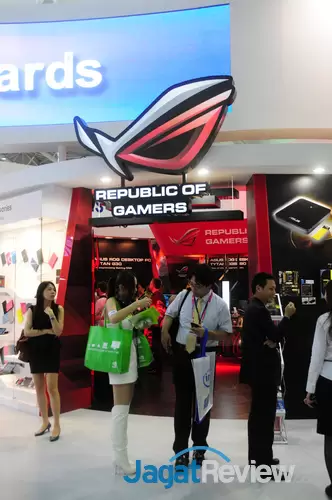 Niat hati ingin menyajikan sebuah foto pembuka yang menampilkan pintu masuk dari booth ROG, tapi apa daya booth yang satu ini selalu ramai dengan pengunjung. Sulit sekali mengambil gambar yang hanya menampilkan booth saja. Booth raid kali ini akan kami fokuskan untuk membahas jajaran produk motherboard dari lini Republic Of Gamer. So here we go…..