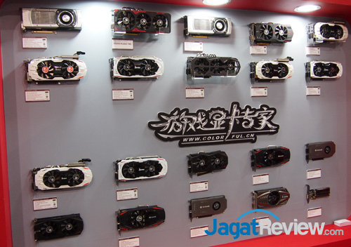 Jajaran produk Chaintech Colorful graphics card yang dipamerkan dalam booth mereka di Computex 2103. Seperti tertera dalam foto, Chaintech memamerkan beberapa graphics card seri lama dan juga baru seperti GeForce GTX 700 di area ini.