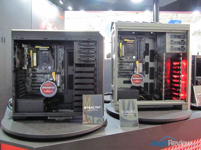Dua casing yang tampak pada foto di atas ini merupakan produk casing Rosewill terbaru yang hadir dalam Computex 2013 kali ini, yaitu casing Stealth dan casing Throne. Casing Throne memiliki ukuran yang lebih besar sehingga mampu mengakomodasi penggunaan board berukuran besar dan memiliki banyak bay 3.5″.