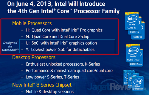 Pada tabel di bawah ini, Anda dapat melihat lineup prosesor Intel Core 4th Generation mulai dari seri M, H, U, dan Y. Setiap prosesor akan mempunyai beberapa perbedaan, seperti kecepatan, Turbo Boost, Besar Cache, TDP, seri graphics on prosesor dan lain sebagainya. Untuk prosesor Intel kelas U dan Y lebih di peruntukkan untuk perangkat ultrabook dan tablet. Sedangkan prosesor Intel kelas M dan H lebih di peruntukkan untuk perangkat All in one PC dan notebook. Anda masih belum dapat melihat prosesor untuk entry level pada tabel di bawah, tetapi nantinya Intel akan segera merilis prosesor untuk kelas itu.